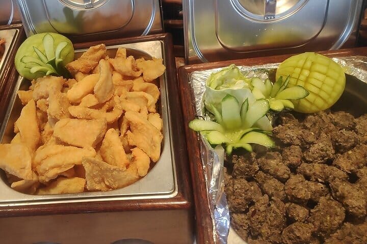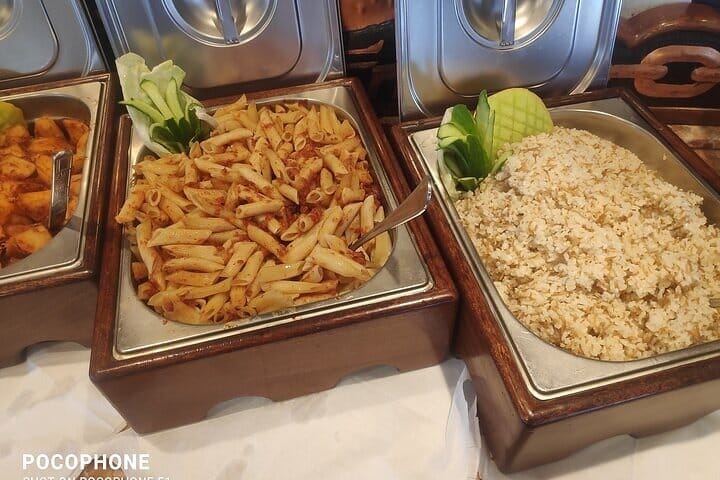 • A freshly prepared Buffet Lunch meal served on Board of the boat deck, including salads, rice, pasta, fish, and chicken.